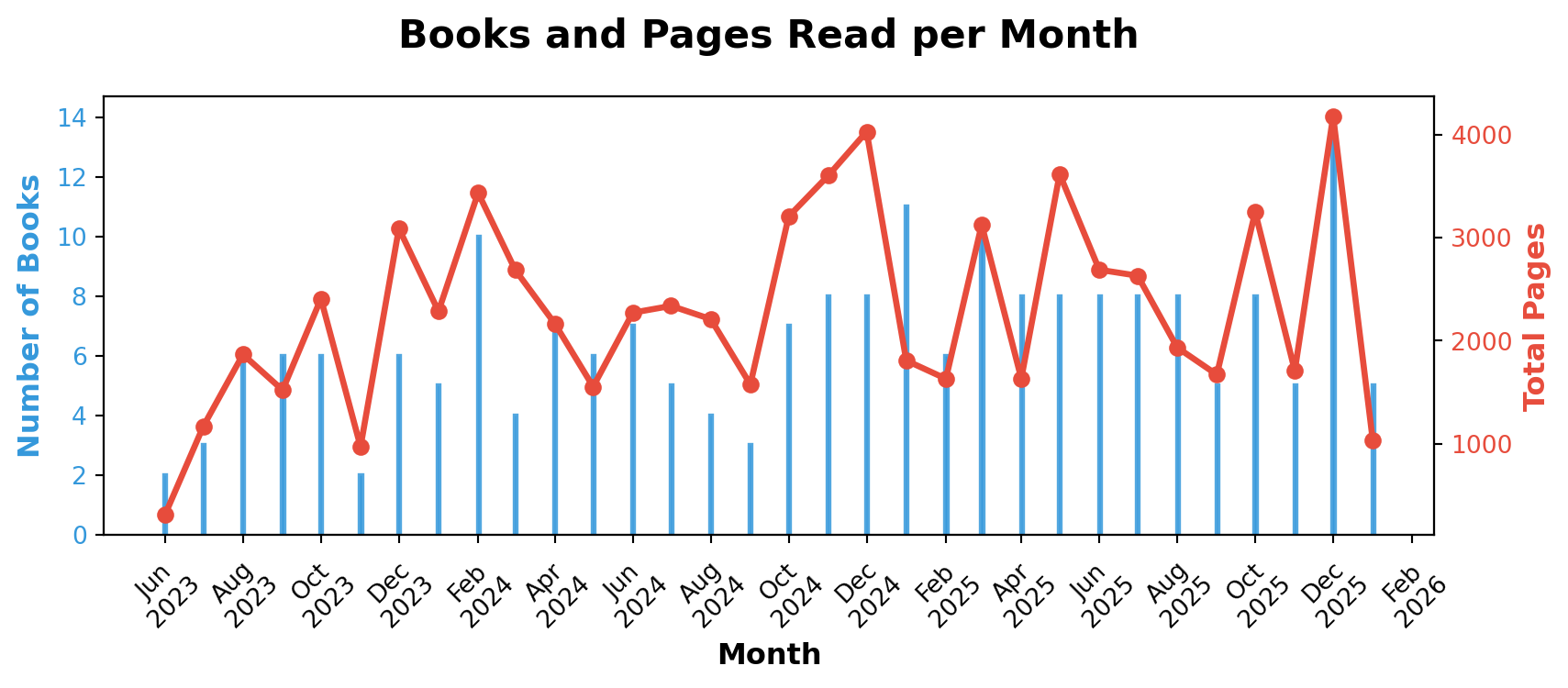 A running tally of how much I’m reading per month! I’m particularly curious about the difference between number of books versus number of pages.