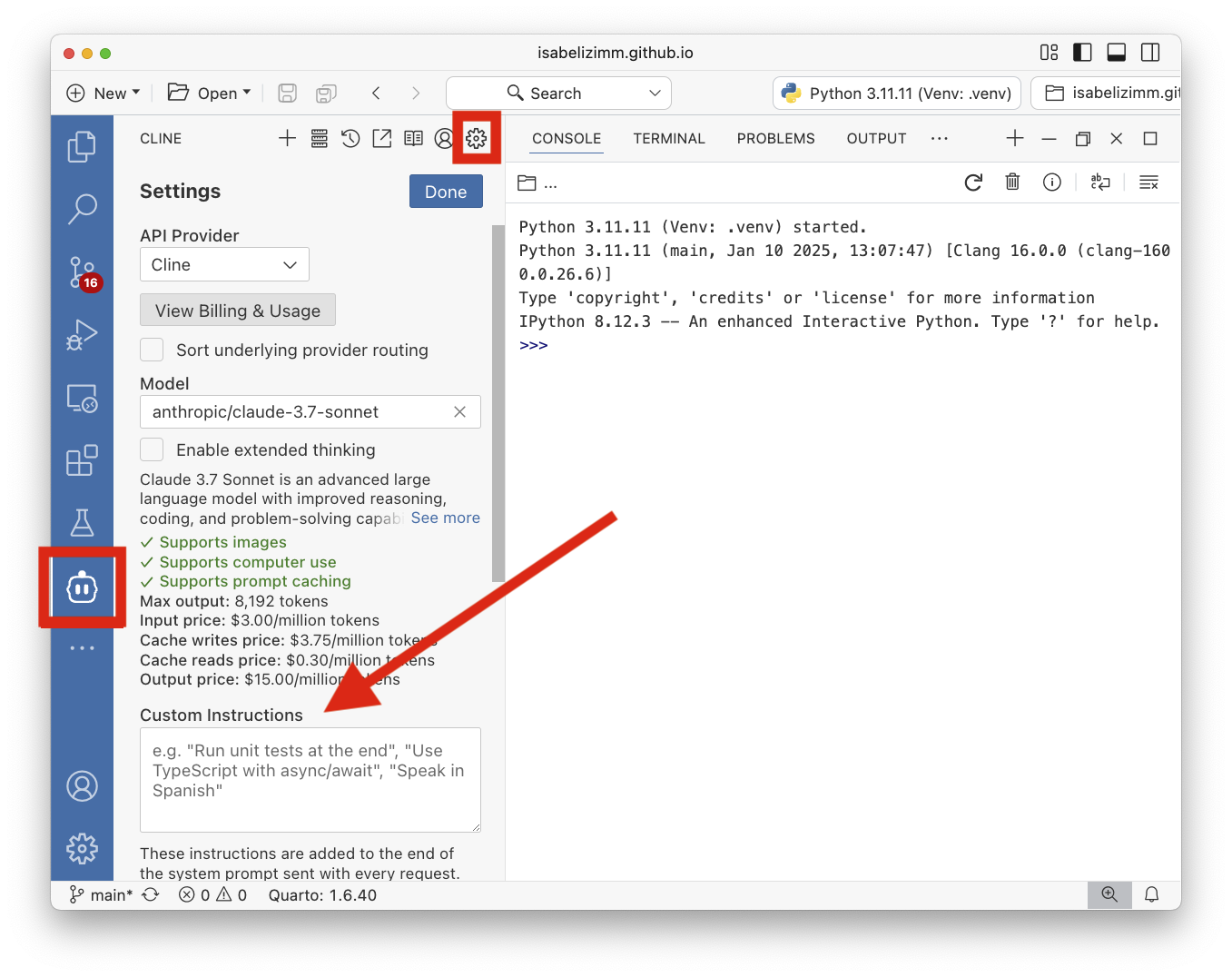 Unlike using Claude in a browser, Cline in Positron understands your code context. It can see your open files, project structure, and even terminal output. This means you get more relevant suggestions and help.