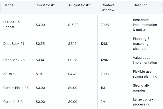 Cline has put together a model comparison for what they consider the best models to use, these are the results as of February 2025.