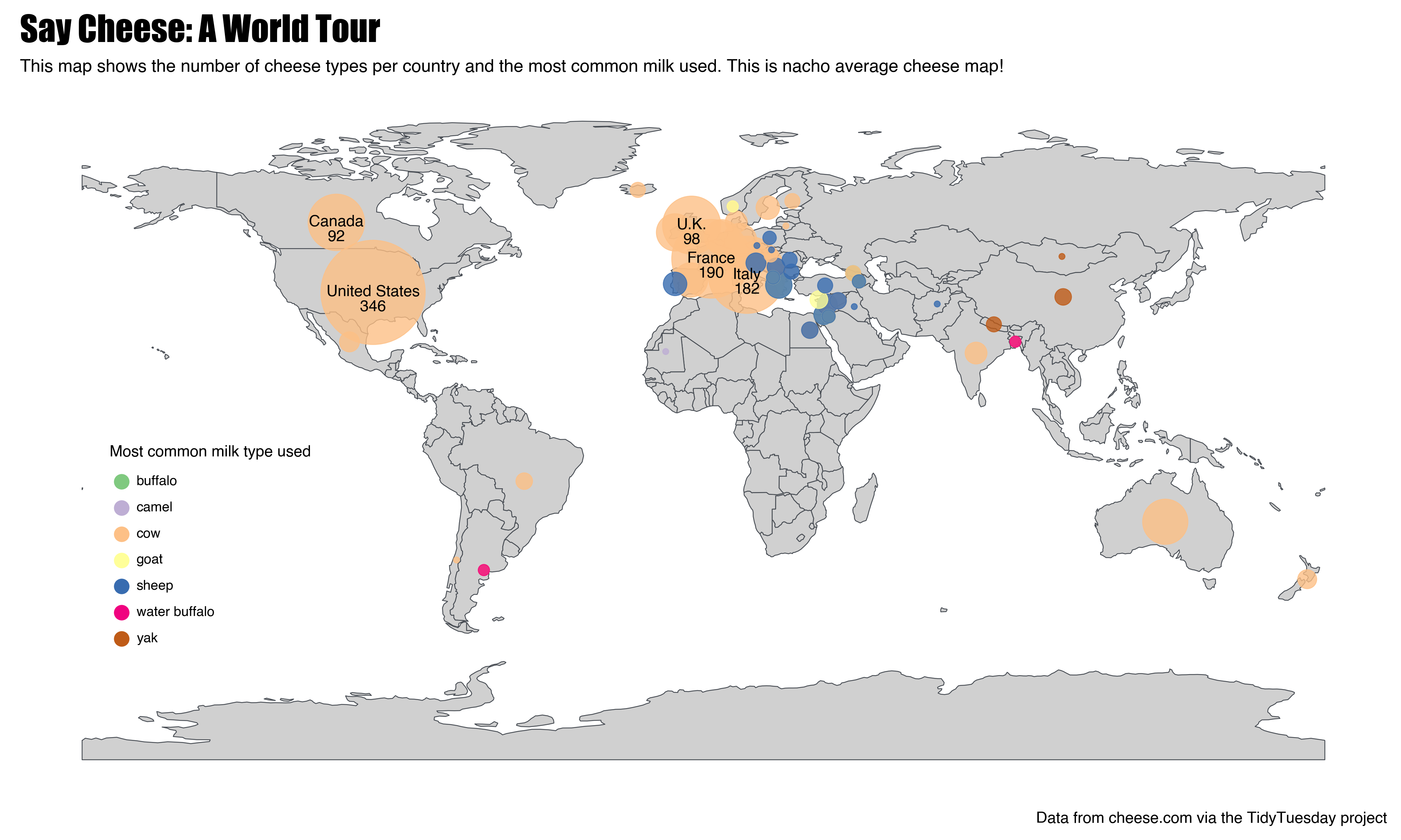 title="This map shows the number of cheese types per country and the most common milk used. This is nacho average cheese map!",
